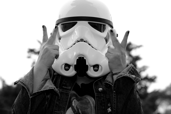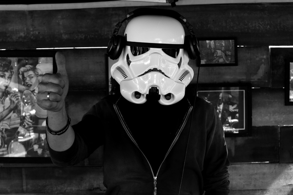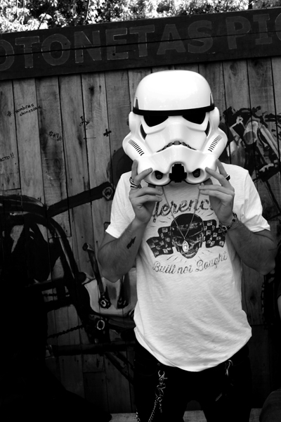 Mika y Luca Bonomi con el casco de Stormtrooper